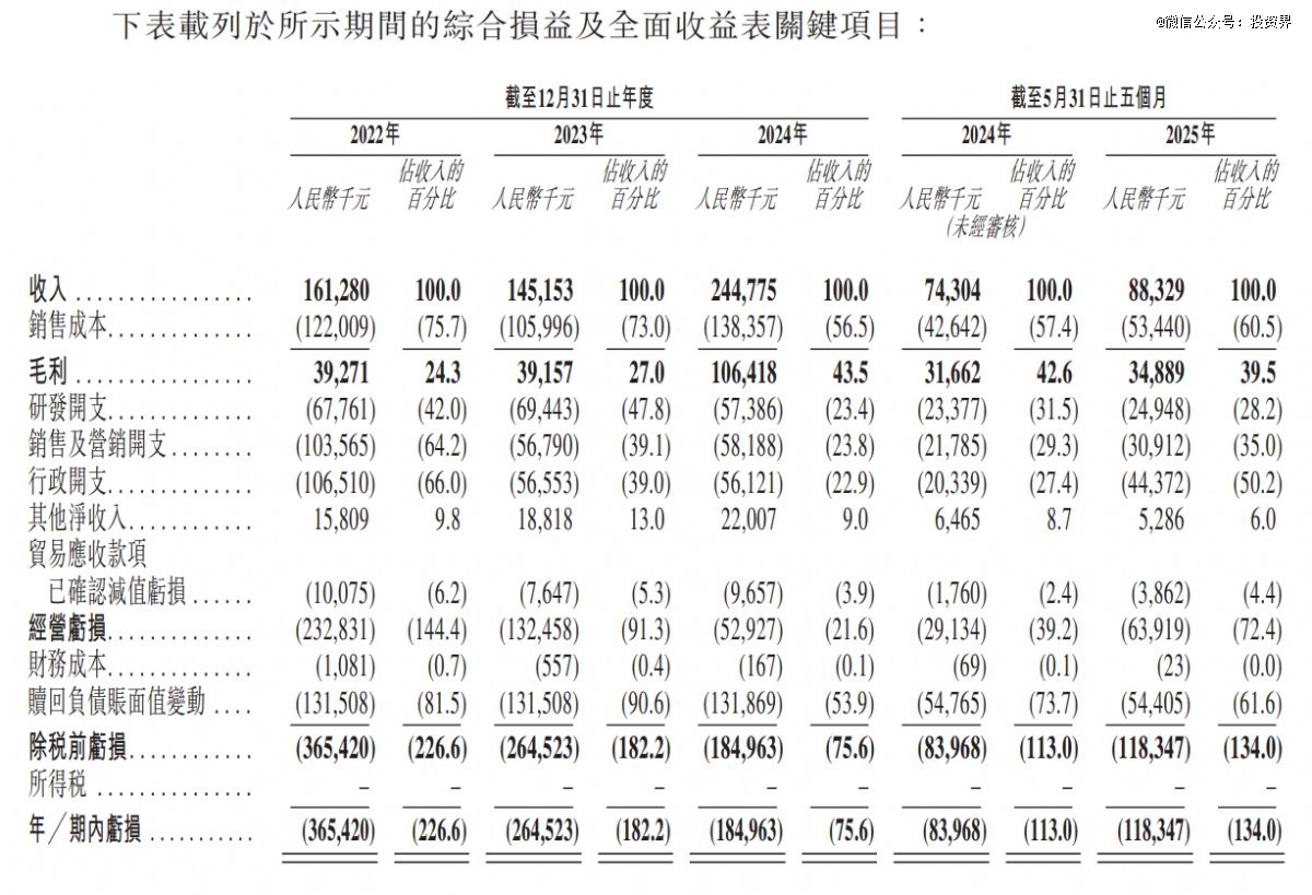 招股书显示,2022年至2024年以及2025年前5个月,云迹科技的收入分别约为1.61亿元、1.45亿元、2.45亿元,以及0.88亿元。报告期内,毛利分别约为0.39亿元、0.39亿元、1.06亿元,以及0.34亿元;毛利率分别为24.3%、27.0%、43.5%,以及39.5%。