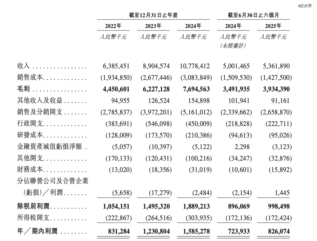 透过招股书,2022-2024年珀莱雅实现收入分别约为63.85亿元、89.05亿元和107.78亿元,同期年利润分别约为8.31亿元、12.31亿元和15.85亿元。2025年上半年,珀莱雅营收53.62亿元,同比增长7.21%,净利润7.99亿元,同比增长13.80%。