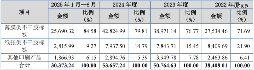 收入结构上,不干胶标签构成了公司的业务支柱,2025年上半年占比超九成。其中,薄膜类不干胶标签所占比例从2022年的71.69%增长至最新的84.58%,呈现逐年上升趋势。
